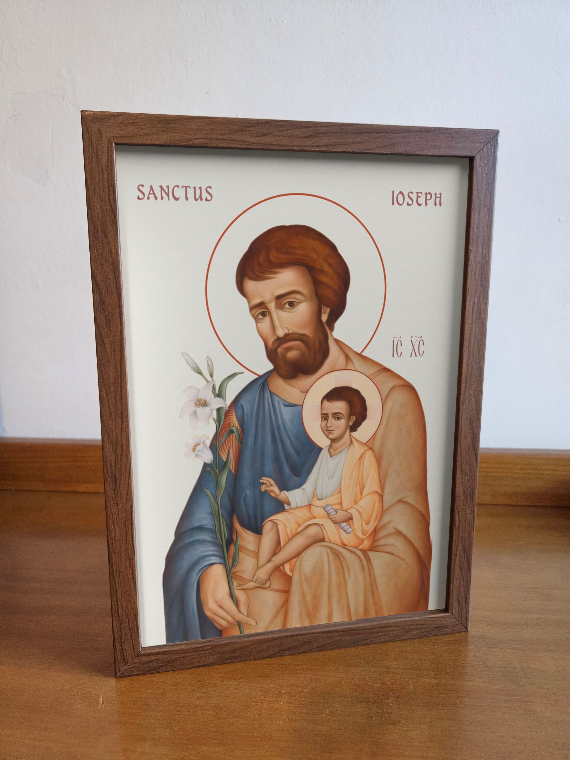 Este belíssimo ícone sacro de São José com o Menino Jesus é uma peça de arte religiosa ideal para devotos e para quem deseja transformar seu lar em uma casa de oração. Com uma moldura de madeira elegante, a imagem apresenta cores suaves e traços delicados, destacando São José segurando um ramo de lírios brancos, símbolo de pureza, enquanto o Menino Jesus traz um pergaminho nas mãos